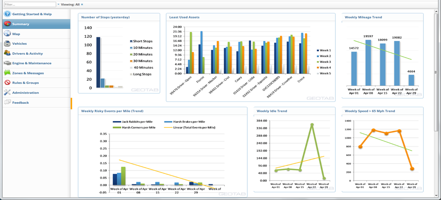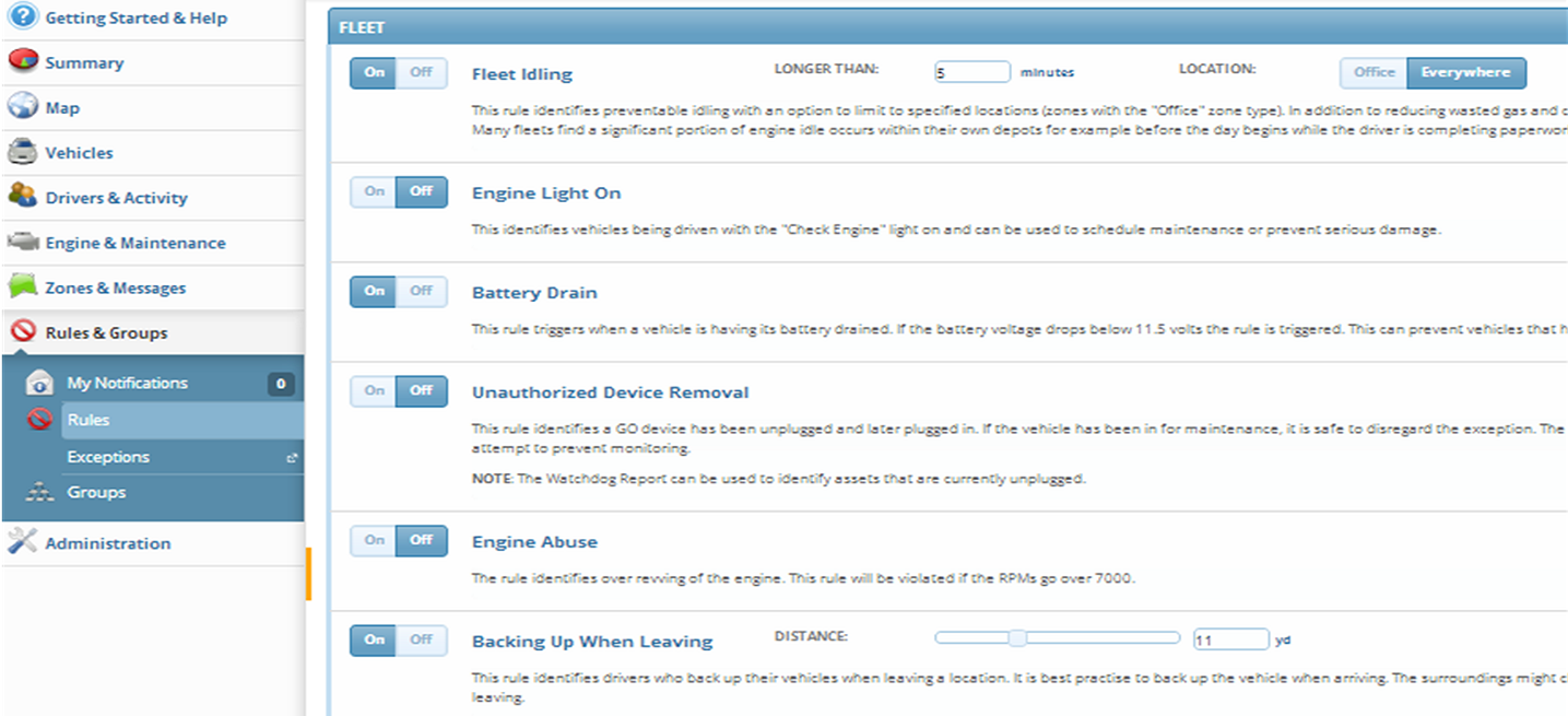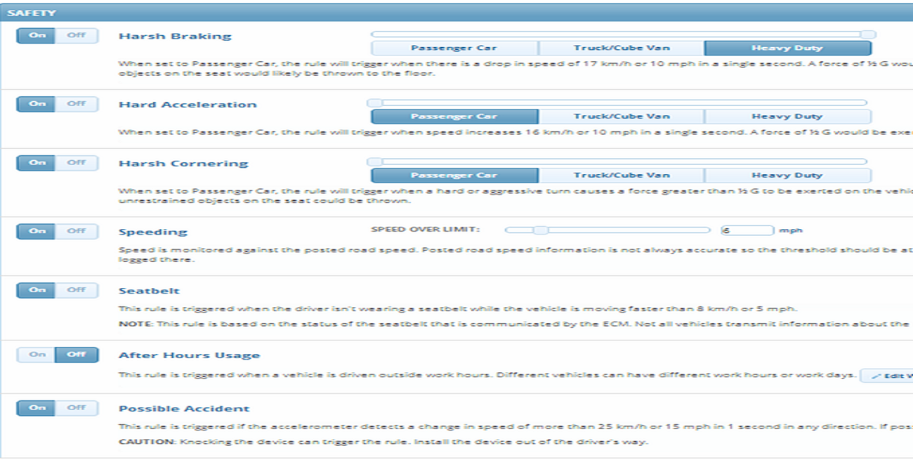 Managing by exception is important. Use one of the preset rules or customize one for the end user. Examples range from accident detection to seatbelt policy management. Once a rule is made, you can create scorecard dashboards and reports.